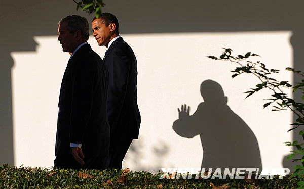 11月10日,美国当选总统奥巴马(右)应邀进入白宫会见现任总统布什,就经济危机和伊拉克战争等问题举行会谈,以确保政府顺利过渡。新华社/法新