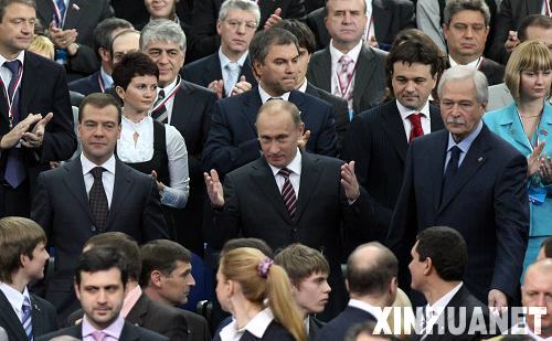 11月20日,俄罗斯总统梅德韦杰夫(中左)、俄总理普京(中)与俄国家杜马(议会下院)主席格雷兹洛夫(中右)共同步入会场。当日,统一俄罗斯党在莫斯科召开第十次代表大会。新华社记者沈伯韩摄