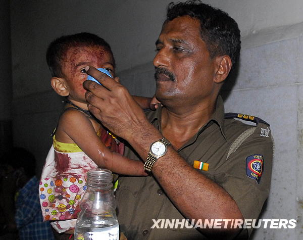 11月26日,一名警察在印度孟买一所医院安抚一名在袭击中受伤的儿童。新华社/路透