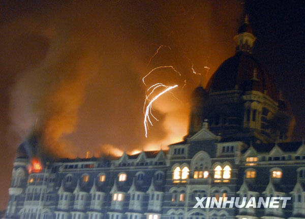 11月27日,印度孟买的泰姬玛哈酒店遭恐怖袭击后发生火灾。26日晚间到27日凌晨,印度孟买市中心的火车站、酒店和市政府等多处建筑遭到武装分子的袭击,目前已造成至少80人死亡、250多人受伤。 新华社/美联