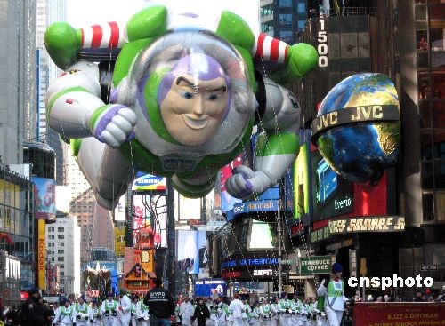 美国纽约第八十二届感恩节大游行于11月27日在曼哈顿百老汇大道举行,预计有300万当地居民和观光客沿街观看。图为首次登场感恩节游行的动画片《玩具总动员》中的卡通人物热气球走过时代广场。 中新社发 邓悦 摄