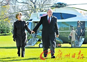 2008年11月30日,布什携妻子劳拉在前往发表关于孟买遭袭声明的路上。