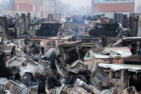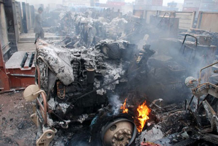 据转运站负责人介绍,大约300名武装分子在黎明前用火箭筒炸开仓库大门,先打死一名值班警卫,然后就开始放火烧车。很快就有106辆汽车葬身火海,其中包括70辆即将送给驻阿富汗美军使用的悍马吉普。在同增援的警方短暂交火后,武装分子一哄而散,下落不明。