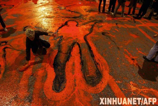 12月8日,在希腊首都雅典,示威者在地上涂抹红色和黑色,象征死者和鲜血。雅典市中心地区的骚乱爆发于6日晚,起因是警察打死一名15岁少年。目前骚乱仍在继续。 新华社/法新
