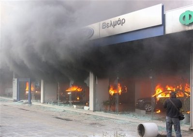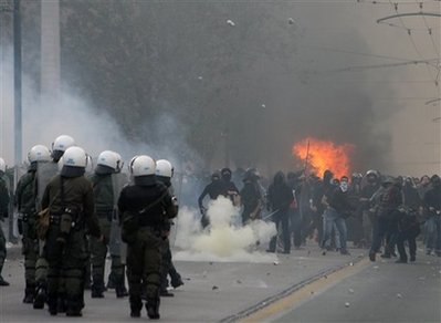 在雅典和北部的萨洛尼卡市中心,大群学生组成的示威队伍向银行、商店和车辆投掷燃烧瓶,警察不得不使用催泪瓦斯驱散示威人群。帕特拉斯、克里特岛和科孚岛也有骚乱发生。