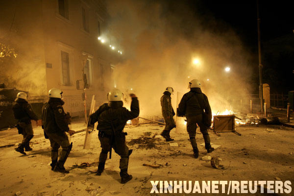 12月8日,防暴警察在希腊首都雅典的一个着火现场。雅典市中心地区的骚乱爆发于6日晚,目前有升级趋势。 新华社/路透