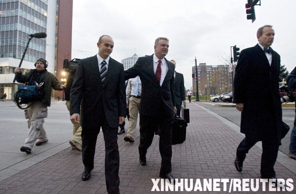 12月8日,前美国“黑水”私人保安公司雇员尼克·斯莱特(中左)和他的律师托马斯·康诺利(中右)到达犹他州盐湖城地方法院。美国司法部当日说,因卷入去年伊拉克一起造成10多名平民死亡的枪击事件,美国“黑水”私人保安公司5名雇员被控14项杀人罪名、20项杀人未遂罪名和一项滥用武器罪名。 新华社/路透