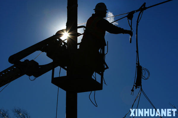 12月13日,在美国缅因州南波特兰,一名电信公司工人抢修在冰风暴中损毁的电缆。一场冰风暴12日登陆美国新英格兰地区,造成大范围电力供应中断和道路交通受阻。美国总统布什13日宣布,遭遇严重冰风暴灾害的马萨诸塞州北部进入紧急状态。 新华社发