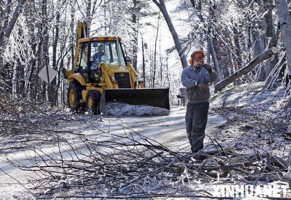 12月13日,在美国新罕布什尔州德里,一名男子在冰风暴过后清理散落在路中央的树枝。一场冰风暴12日登陆美国新英格兰地区,造成大范围电力供应中断和道路交通受阻。美国总统布什13日宣布,遭遇严重冰风暴灾害的马萨诸塞州北部进入紧急状态。 新华社发