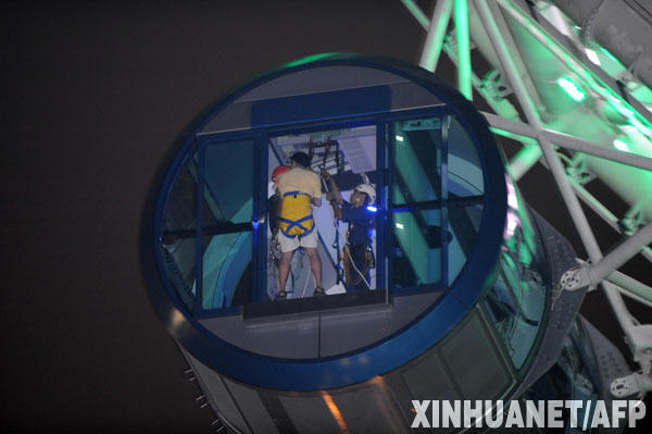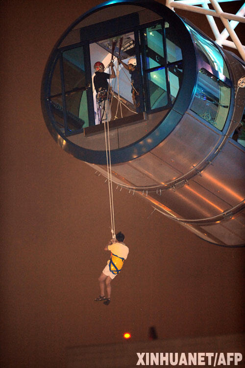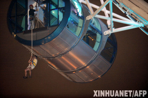 12月23日,工作人员用绳索转移一名被困在新加坡摩天观景轮座舱中的游客。 新华社/法新