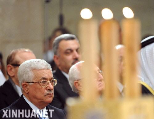 12月24日夜,巴勒斯坦民族权力机构主席阿巴斯(左)在约旦河西岸城市伯利恒的圣凯瑟琳教堂出席圣诞节午夜弥撒。 新华社记者殷博古摄