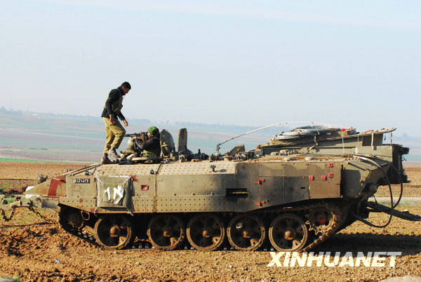 1月5日,在加沙北部边境地区,以色列士兵在装甲车上警戒。当日,以色列军队继续地面进攻加沙地带,并已将加沙地带分隔成南北两块区域。以军发动的“铸铅”军事行动目前已造成巴勒斯坦方面514人死亡,约2600人受伤。新华社发(拉菲尔摄)