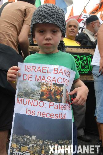 2009年1月7日 阿根廷举行抗议活动反对以军入侵加沙 1月6日,一名儿童举着反战标语参加在阿根廷首都布宜诺斯艾利斯举行的反战游行。阿根廷的阿拉伯移民及当地民众在布宜诺斯艾利斯市中心举行示威游行,反对以色列军队入侵加沙。 新华社/美洲通讯社