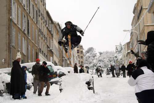 法国第二大城市马赛7日降大雪,市民在城内练习滑雪。