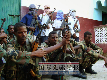 常年战乱让索马里民不聊生。图为部分索马里士兵(前着军装者)因薪酬低、得不到政府尊重,转而投奔伊斯兰反政府武装(后持枪站立者)。法新社