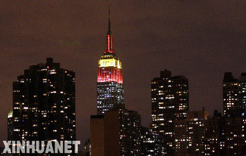 图为2008年2月7日,纽约帝国大厦亮起象征喜庆吉祥的红黄两色彩灯,向华人和亚裔人士贺新春。当天晚上,帝国大厦总经理詹姆斯·康纳斯和中国驻纽约总领事彭克玉出席了纽约帝国大厦的点灯仪式。 新华社记者刘宗亚摄
