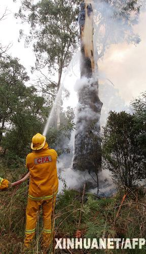 澳大利亚山林大火肆虐 2月8日,在澳大利亚维多利亚州首府墨尔本北部,消防员为仍在燃烧的大树灭火。澳东南部正遭遇25年来最严重的山林大火。新华社/法新