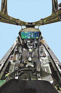 F-35座舱中,飞行员用了几十年的“梳妆镜”——平显不见了,取而代之的是虚拟头盔显示器。F-35是世界上首次使用虚拟头盔显示器的战斗机,安装在头盔上的显示装置直接把画面投射在飞行员的面罩上。飞行员可以随意向不同方向转动头部,获取目标的实时信息,然后瞄准攻击。此外,虚拟头盔显示器还与F-35上的360°红外传感装置相连,使飞行员可以看到后方的情况。