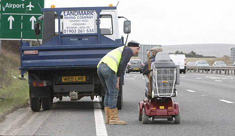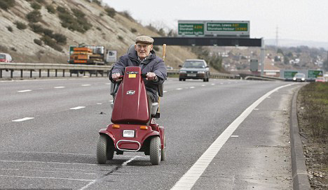 英国肖勒姆市90岁退休老人斯坦利·墨菲驾着他的踏板车在高速公路上疾驰。