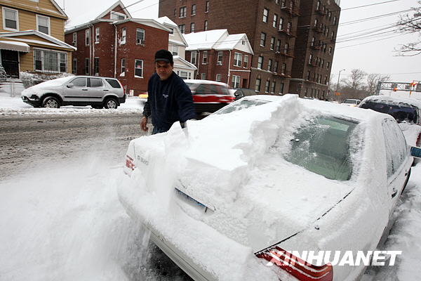 3月2日,美国纽约的一名市民清扫自家车上的积雪。