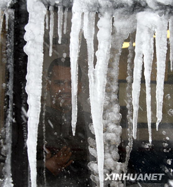 3月2日,在美国纽约,一名男子从挂满冰柱的窗户内向外张望。新华社记者刘欣摄