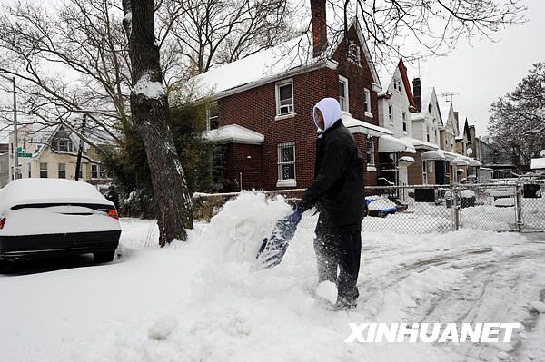 3月2日,在纽约皇后区,一位市民清扫房前积雪。新华社记者谷欣容摄