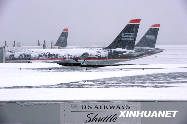 3月2日,在纽约拉瓜迪亚机场,飞机停落在停机坪上。新华社记者谷欣容摄