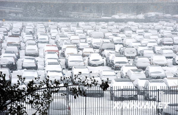 3月2日,在纽约拉瓜地机场,众多车辆滞留在停车场上。新华社记者谷欣容摄