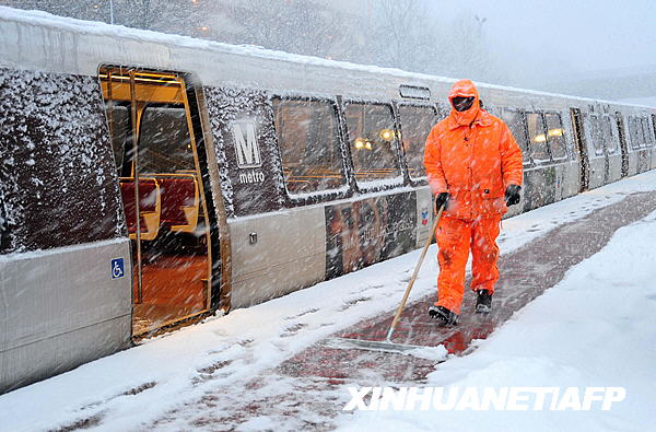 3月2日,在美国弗吉尼亚州维也纳的一个城铁站台上,一名工人清扫积雪。新华社/法新
