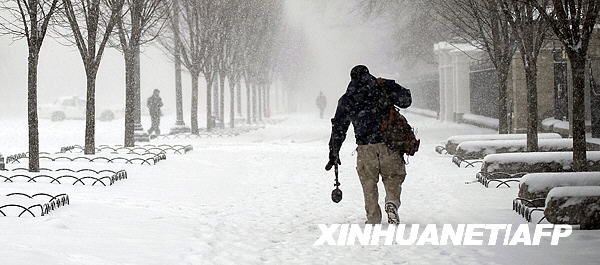 3月2日,在美国华盛顿,一名行人冒雪前行。新华社/法新