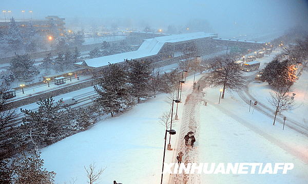 3月2日,在美国弗吉尼亚州维也纳的一个城铁站附近,行人冒雪步行。新华社/法新