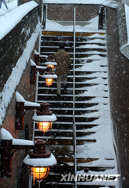 3月2日,一位乘客从纽约中央公园附近的一个地铁站内走出。1日起袭击纽约的强降雪在2日上午达到23厘米。新华社记者申宏摄