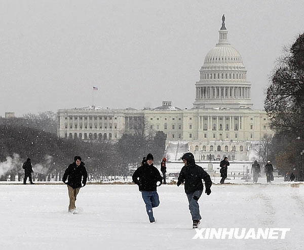 3月2日,在美国华盛顿国家大草坪,行人在雪地中行进。美国东部地区1日遭受史上3月份罕见强大冰雪袭击。至2日晨,部分地区降雪超过30厘米。恶劣天气和大量降雪导致多所学校被迫关闭、路面交通状况恶化、众多航班延误或取消。新华社记者张岩摄