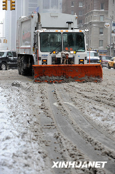 3月2日,铲雪车在纽约曼哈顿的道路上清理积雪。美国东部地区从1日夜开始遭受史上3月份罕见大雪袭击。纽约市出动大约2000名环卫工人投入到除雪等工作中,虽然大雪给市民出行造成不便,但城市公交系统总体运行正常。新华社记者申宏摄