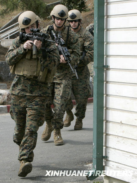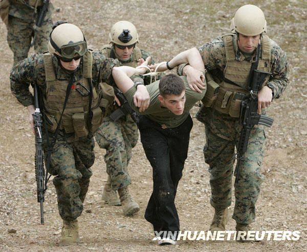 3月9日,在韩国首都首尔东南410公里的镇海美军基地,美国海军陆战队太平洋反恐安全小组的成员模拟抓捕“入侵者”。新华社/路透