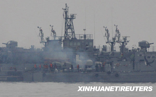 3月9日,参加演习的韩国海军的军舰在延平岛海域抛锚。新华社/路透