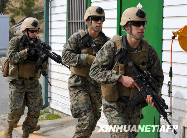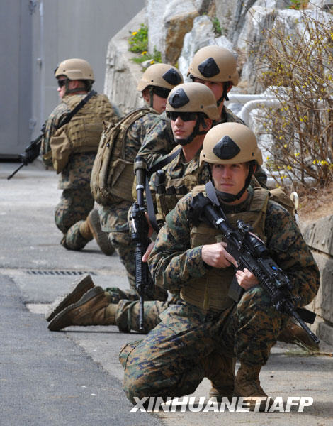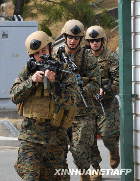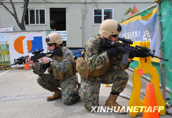 3月9日,在韩国首都首尔东南410公里的镇海美军基地,美国海军陆战队太平洋反恐安全小组参加演习。