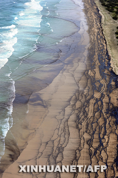 3月12日,在澳大利亚昆士兰州的海边,泄漏的燃油将海滩污染。新华社/法新