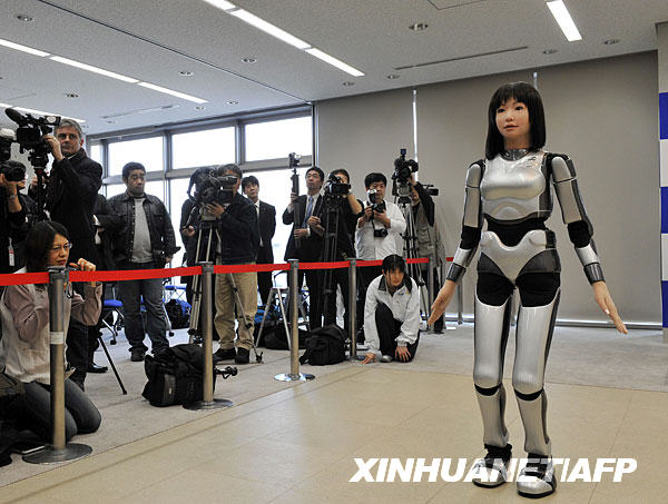 3月16日,研究人员在日本茨城县筑波市向媒体展示代号为“HRP-4C”的机器人。HRP-4C“身高”1.58米,“体重”含电池43公斤,有一张女性面孔,大眼睛,鼻子小巧,充电一次可行动约20分钟。它能说话,会做出多种表情。该机器人将于3月23日在东京登台进行时装展示。新华社/法新