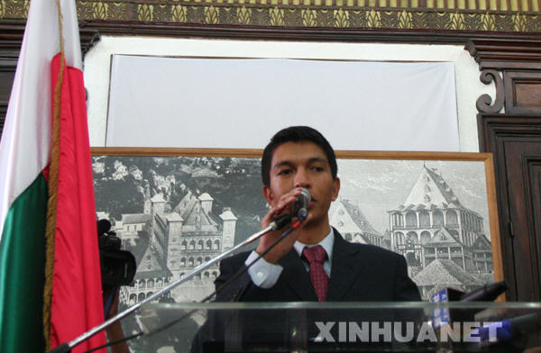 3月17日,马达加斯加反对派领导人拉乔利纳在位于塔那那利佛市中心的总统府发表讲话。当天,拉乔利纳进入支持他的武装部队前一天占领的市中心总统府内,并参加总统府“接管仪式”,宣布已经取得了“胜利”。新华社记者王璐摄