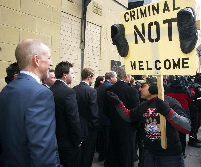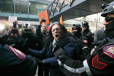 据报道,被警察逮捕的一名男子表示,他试图进入演讲会场“逮捕布什”。他称“布什犯下谋杀罪行”,被捕时他还不断高喊“逮捕布什”。众多示威群众举着“对美国违反人道的罪行说不”,“以战争罪犯名义起诉布什”,“加拿大不是布什国”等标语,在布什演讲场地大楼外示威。