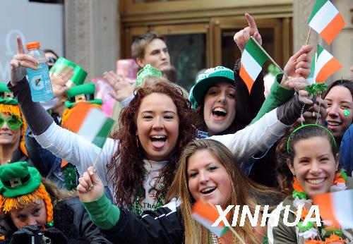 3月17日,在美国纽约曼哈顿,观众兴奋地和圣帕特里克节游行队伍打招呼。当日,纽约举行盛大游行,庆祝圣帕特里克节。圣帕特里克节是爱尔兰人纪念爱尔兰守护神圣帕特里克的节日,至今已有1500多年历史,这一节庆传统被爱尔兰移民带入美国。新华社记者 申宏 摄