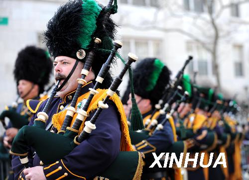 3月17日,在美国纽约曼哈顿,爱尔兰乐手在圣帕特里克节游行中表演。当日,纽约举行盛大游行,庆祝圣帕特里克节。圣帕特里克节是爱尔兰人纪念爱尔兰守护神圣帕特里克的节日,至今已有1500多年历史,这一节庆传统被爱尔兰移民带入美国。新华社记者 申宏 摄