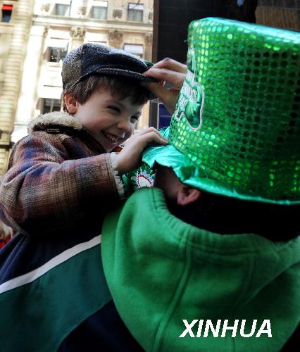 3月17日,在美国纽约曼哈顿,一名男孩为父亲戴上喜庆的绿色帽子。当日,纽约举行盛大游行活动庆祝圣帕特里克节。圣帕特里克节是爱尔兰人纪念爱尔兰守护神圣帕特里克的节日,至今已有1500多年历史,这一节庆传统被爱尔兰移民带入美国。新华社记者 谷欣容摄