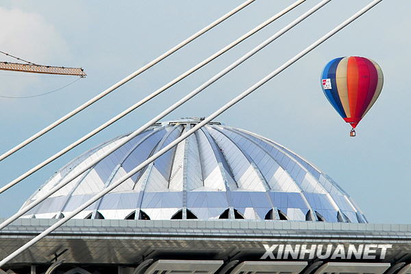 3月19日,一个热气球飞过普特拉贾亚一个正在建设的清真寺。新华社发(张纹综摄)