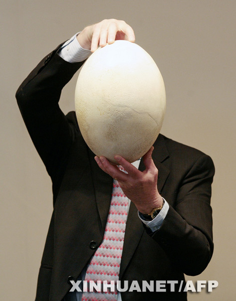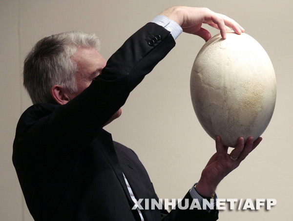 3月25日,一名男子在英国伦敦展示一枚据称是“世界上最大的蛋”。这枚由已经灭绝的马达加斯加象鸟在十七世纪产下的蛋,将在当天举行的切尔西古董展上出售,标价5000英镑(约合7340美元)。新华社/法新