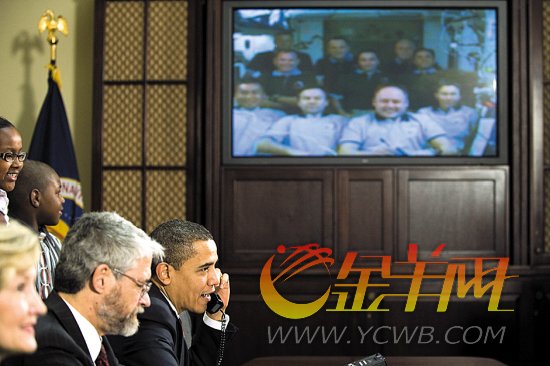 美国总统奥巴马24日与国际空间站上10名宇航员视频“连线”,彼此寒暄,互相发问。(来源:金羊网-羊城晚报)