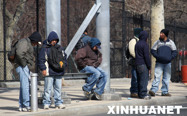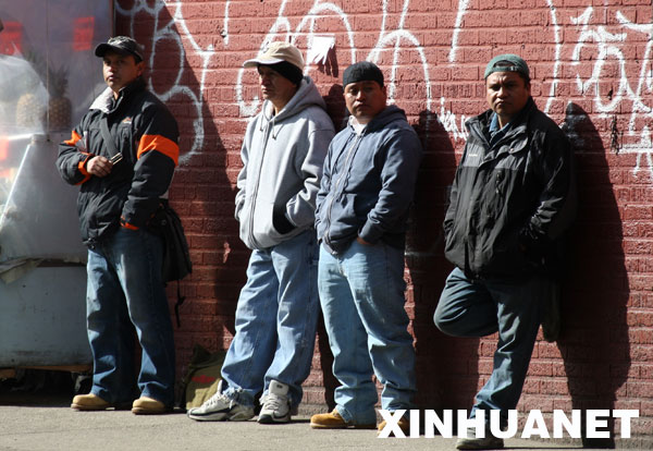3月25日,几名失业者在美国纽约皇后区街头等待雇主的雇佣。新华社记者刘欣摄