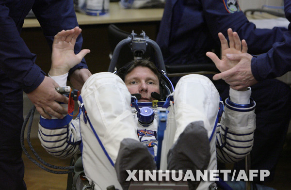 3月26日,在哈萨克斯坦拜科努尔发射场,全球第5名“太空游客”、美国富翁查尔斯·西蒙尼做升空准备。新华社/法新