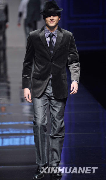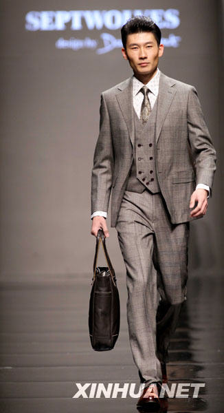 3月29日,模特孟飞在北京举行的中国国际时装周发布会上展示某服装品牌的男装。新华社记者陈建力摄